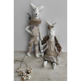 Minkšti rankų darbo žaislai pasiūti iš natūralaus lino. Komplektą sudaro trys žaislai - zuikis, zuikienė ir zuikelis.Originalūs žaislai - vienetiniai, kruopščiai pasiūti ir išpuošti. Rūbelius galima nuimti ir įsigyti jų papildymą.Zuikio ir zuikienės aukštis - 37 cm...