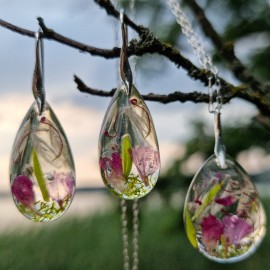 Pakabukas ir auskarai su violetinėm gėlytėm ir geltonom samanom:Aukštos kokybės juvelyrinė derva (lengvi, nedūžta)Tikri augalaiPakabukas - lašelio formos 30 x 15 mmAuskarai - lašelio formos 30 x 15 mm (ilgis su užsegimo kabliuku 50 x 15 mm)Visos detalės - sidabras 925Sidabrinės grandinėlės ilgis 40 cm (su prailginimu 47 ..