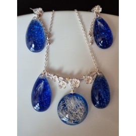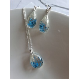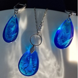 Pakabukas ir auskarai su melsvom gėlytėm ir nendrių pūkeliais:Aukštos kokybės juvelyrinė derva (lengvi, nedūžta)Tikri augalaiPakabukas - lašiuko formos 30 x 15 mmAuskarai - lašelio formos 30 x 15 mm (ilgis su angliško tipo užsegimu 100 x 15 mm)Visos detalės - sidabras 925Sidabrinės grandinėlės ilgis 40 cm (su prail..