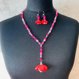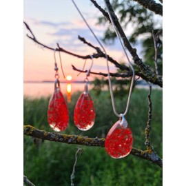 Pakabukas ir auskarai su raudonom gėlytėm:Aukštos kokybės juvelyrinė derva (lengvi, nedūžta)Tikri augalaiPakabukas - lašiuko formos 30 x 15 mmAuskarai - lašelio formos 30 x 15 mm (ilgis su angliško tipo užsegimu 90 x 15 mm)Visos detalės - sidabras 925Sidabrinės grandinėlės ilgis 40 cm (su prailginimu - 46 cm) .Pris..