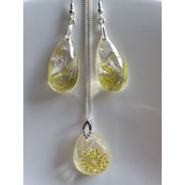 Pakabukas ir auskarai su geltona gėlyte ir nendrių šakelėmis:Aukštos kokybės juvelyrinė derva (lengvi, nedūžta)Tikri augalaiPakabukas - lašo formos 30 x 23 mmAuskarai - lašelio formos 30 x 15 mm (ilgis su angliško tipo užsegimu 45 x 15 mm)Visos detalės - sidabras 925Sidabrinės grandinėlės ilgis 40 cm. ( su prailginimu - ..
