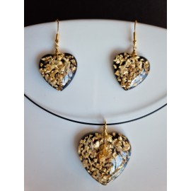 Pakabukas ir auskarai su aukso folija:Aukštos kokybės juvelyrinė derva (lengvi, nedūžta)Tikri augalaiPakabukas - širdelės formos 35 x 35 mmAuskarai - širdelės formos 22 x 22 mm (ilgis su užsegim0 kabliuku 45 x 22 mm)Visos detalės - sidabras 925 dengtas auksuJuodo droselio ilgis 45 cm.Pristatymas Lietuvoje - nemokam..