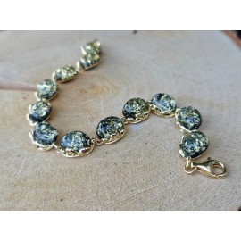 Žalvaris su piritu. Apyrankė sudaryta iš paslankių detalių, todėl ji idealiai apgaubia riešą. Rankų darbo užsegimas yra ne tik puošnus ir tvirtas, bet ir patogus, lengvai užsidėsite apyrankę patys.Įdėklas- Piritas.Piritas – galingas apsaugos akmuo, apsaugantis nuo neigiamos energijos, neutralizuoja negatyvias energijasTinka -17,5 -18,5 cm.rankos ap..