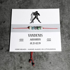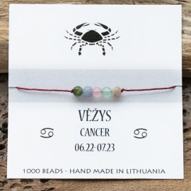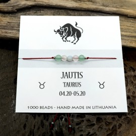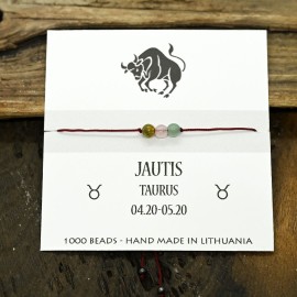 Akmenukai parinkti pagal tinkamumą ženklui, natūralūs, 4 mm dydžio: amazonitas, akvamarinas, fluoritas, turkis. Plona raudona virvutė. Yra kiekvieno akmenuko aprašymas. Tinka tiek vyrams, moterims. Dydis reguliuojasi dėka slankiojančių virvučių. Dovanų pakuotėje. Akmenukai, kadangi natūralūs, nežymiai gali skirtis savo atspalviu, raštu...