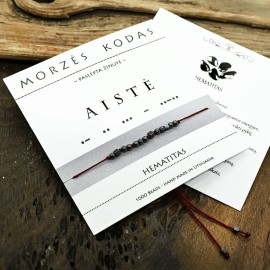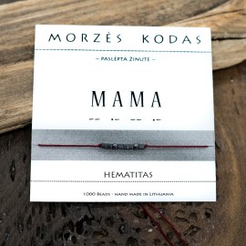 Plonytės, tamsiai raudonos, virvutės Sėkmės apyrankė, Morzės abėcėle, iš mažyčių 2 mm hematito akmenukų, suvertas žodis "Mama".Kartu pridedama kortelė su hematito akmens reikšme.Dydis - ilgis reguliuojasi. Dovanų pakuotėje...