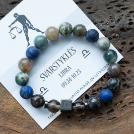 Akmenukai parinkti pagal tinkamumą Svarstyklių ženklui: dūminis kvarcas, rodonitas, lazuritas, agatas, jaspis.Graviruotas zodiako ženklas ant hematito akmens kubo.Dovanų dėžutėje.Kartu pridedami akmenukų aprašymai - reikšmės.Tinkama riešui iki max 17 cm. Jei reikia kito dydžio - susisiekite asmeniškai...