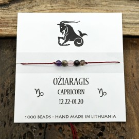 Akmenukai parinkti pagal tinkamumą ženklui, natūralūs, 4 mm dydžio: ametistas, agatas, rožinis kvarcas, granatas, dūminis kvarcas. Yra kiekvieno akmenuko aprašymas. Tinka tiek vyrams, moterims, vaikams. Dydis reguliuojasi dėka slankiojančių virvučių. Dovanų pakuotėje. Akmenukai, kadangi natūralūs, nežymiai gali skirtis savo atspalviu, raštu...