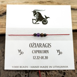 Sėkmės apsaugos apyrankė Ožiaragio ženklui.Akmenukai 3-4 mm dydžio: granatas, ametistas, tigro akis.Yra kiekvieno akmenuko aprašymas. Tinka tiek vyrams, moterims, vaikams.Akmenukai, kadangi natūralūs, nežymiai gali skirtis savo atspalviu, raštu. Siuntimas Lietuvoje nemokamas. ..