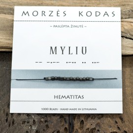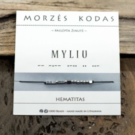 Pasakyk "MYLIU" kitaip. Plonytės juodos virvutės Sėkmės apyrankė, Morzės abėcėle iš mažyčių 2 mm hematito akmenukų, blizgios sidabro spalvos, suvertas žodis "Myliu".Dydis - ilgis reguliuojasi. Dovanų pakuotėje...
