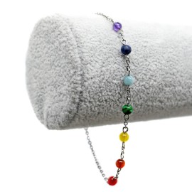 Nerūdijančio plieno plona grandinėlė, su natūraliais akmenukais, atitinkančiais 7-ias energetines čakras.Kiekvienas akmenukas atitinka vieną iš septynių čakrų, tikima, kad tai gali padėti subalansuoti ir atblokuoti gyvybinę energiją.Grandinėlė gali būti pritaikyta nešioti ant rankos, arba ant kojos. Užsakymo metu pastabose nurodykite reikiamą ilgį...