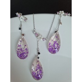 Pakabukas ir auskarai su violetinėmis gėlytėmis:Aukštos kokybės juvelyrinė derva (lengvi, nedūžta)Tikri augalaiPakabukas - lašelio formos 30 x 15 mmAuskarai - lašelio formos 30 x 15 mm (ilgis su užsegim0 kabliuku 55 x 15 mm)Visos detalės - sidabras 925Sidabrinės grandinėlės ilgis 40 cm (su prailginimu 46 cm).Pristatymas ..