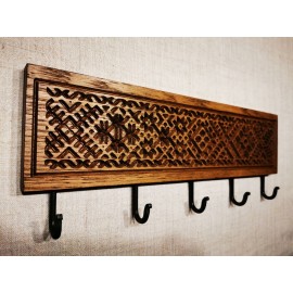 Tautinio paveldo motyvais puošta ąžuolinė sieninė rūbu kabykla su lentyna „Etno“ – tai funkcionalus ir dekoratyvus interjero elementas, puikiai tinkantis prieškambariui, sodybai ar kaimiško stiliaus erdvei. Dėl subtilaus dizaino ir kokybiškų medžiagų, ši kabykla tampa ne tik praktine, bet ir estetinio grožio detale.