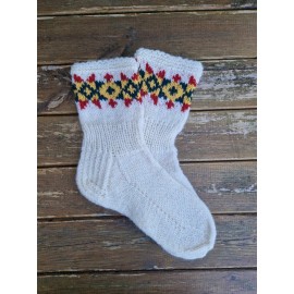 Švelnios 36-37 dydžio moteriškos vilnonės kojinės (galima užsisakyti ir kitą dydį). Megzta rankomis iš baltų naminių avies vilnos siūlų, marginta trispalvės spalvomis. Kulnas - dvigubu mezgimu. Tinka ir vyriškiui kaip dovana, kad sušildytų merginos širdį :)Jei užsisakote daugiau nei dvejas kojines, numezgimui reikės daugiau laiko, nei nurodyta..
