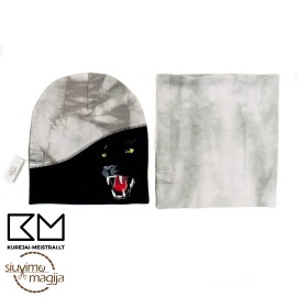 Komplektą sudaro kepurė ir mova Pantera siuvinėta Sudėtis medvilnėgalima rinktis movos spalvą..