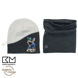 Komplektą sudaro kepurė ir movaKepurė, su siuvinėtu šuniukuSudėtis medvilnė..