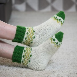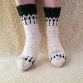Vyriškos 41-42 dydžio vilnonės kojinės (galima užsisakyti ir kitą dydį bei spalvą). Megztos rankomis iš naminių baltos ir tamsiai žalios spalvos avies vilnos siūlų. Kulnas pastiprintas dvigubu mezgimu. Jei užsisakote daugiau nei dvejas kojines, numezgimui reikės daugiau laiko, nei nurodyta parduotuvės taisyklėse. ..