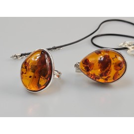 Gintarinis pakabus ir žiedas. Žiedas reguliuojamo dydžio. Sidabras 925. Grandinėlė ir odinė virvelė - dovana. Tai tikras gintaras ir rankų darbo dovana. Pakabuko ilgis 4 cm. Svoris 13 gr. Žiedas 12,30 gr. 2,6 cm ..
