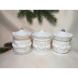 Sojų vaško žvakės Karuselė. Levandų ir kramtomos gumos kvapo. Skersmuo 8.5cm, aukštis 9 cm. Dėžutė 11x12 cm. A aukso spalvos levandų kvapo, B sidabro spalva kramtomos gumos kvapas, C balta spalva kramtomos gumos kvapas.Sojų vaškas, tai natūralus, ekologiškas, draugiškas aplinkai produktas.Žvakelė papuošia namų interjerą, išvalo erdvę, priduoda jauk..