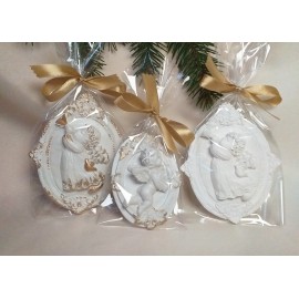 Magnetukai su angelais iš gipso, puošti aukso spalva. Su trimitu dydis 11x9 cm, mažesnis 8x6 cm. A baltas, B puoštas aukso spalva, C mažesnis. Prekių siuntimas 1-3 darbo dienos tik paštomatais.Gipsas - natūralus, aplinkai draugiškas produktas. Kiekvienas daiktas pagamintas rankomis, todėl oro "burbuliukai", akutės, natūralaus gamybos proceso d..