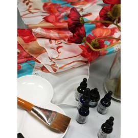 Akvarelės liejimo technika tapytas storas natūralus šilkas (krepsatinas.). Viena pusė blizgi (satinas), Kita pusė matine (krepas.) Ryškios tviskančios spalvos primins kartštos vasaros dienos dvelksmą, žydinčių gėlių virpėjimą, pievos kvapą.. Tai nuostabus ryškus akcentas drąsioms ir mėgstančioms iššsiskirti moterims.Natūralus šilkas : KREPSAT..