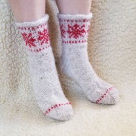 Švelnios 36-37 dydžio moteriškos vilnonės kojinės (galima užsisakyti ir kitą dydį). Megzta rankomis iš baltų naminių avies vilnos siūlų, marginta raudonai. Kulnas - dvigubu mezgimu. Tinka ir vyriškiui kaip dovana, kad sušildytų merginos širdį :)