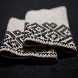 Merino vilna, smėlio spalvos , tamsiai rudi blizgūs karoliukai.Raštas iš senovinės audimo knygos.Ilgis-11c, plotis aplink riešą-17cm( gali išsitempti apie 1-2cm) https://v-u-riesines..