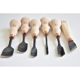 12 vnt. aukštos kokybės, rankų darbo, medžio drožybos įrankių rinkinys, tinkantis tiek pradedantiesiems, tiek profesionalams. Komplektas yra universalus, tinkantis ornamentikai, skulptūrėlių drožybai ir šaukštų gamybai. Puikiai tinkamas minkštam ir kietam medžiui. Įrankiai pagaminti iš aukštos kokybės anglinio plieno, 51CrV4. Po grūdinimo plienas pasiekia apie 57 HRC kietumą. Ašmenys užgaląsti ir užpoliruoti oda, įtrinta abrazyvine pasta ir paruošti naudoti tiesiai iš dėžutės.