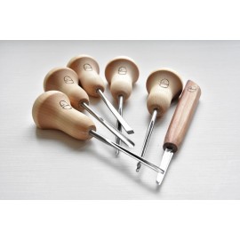 6 vnt. aukštos kokybės, rankų darbo, medžio drožybos įrankių rinkinys, tinkantis tiek pradedantiesiems, tiek profesionalams. Komplektas yra skirtas smulkioms detalėms drožinėti, puikiai tinka lino raižiniams. Įrankiai pagaminti iš aukštos kokybės anglinio plieno, 51CrV4. Yra naudojami ir minkštam ir kietam medžiui. Po grūdinimo plienas pasiekia apie 57 HRC kietumą. Ašmenys užgaląsti ir užpoliruoti oda, įtrinta abrazyvine pasta ir paruošti naudoti tiesiai iš dėžutės. Rankenėlė yra patogi, neslidi, pagaminta iš beržo medienos.