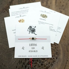 Akmenukai parinkti pagal tinkamumą ženklui, natūralūs, 4 mm dydžio: amazonitas, akvamarinas, fluoritas, turkis. Plona raudona virvutė. Yra kiekvieno akmenuko aprašymas. Tinka tiek vyrams, moterims. Dydis reguliuojasi dėka slankiojančių virvučių. Dovanų pakuotėje. Akmenukai, kadangi natūralūs, nežymiai gali skirtis savo atspalviu, raštu.